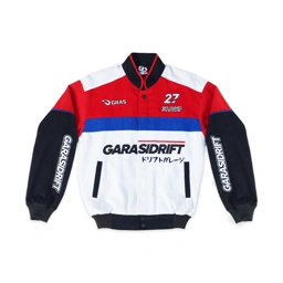Step into the fast lane with the Garasi Drift X GIIAS Varsity Jacket – Mecha Hyperline. Designed with bold red, white, blue, and black panels, this jacket draws inspiration from high-performance race liveries and futuristic mecha aesthetics.Featuring premium embroidery of the Garasi Drift and GIIAS logos, the number “27,” and Japanese katakana detailing, it’s a statement piece that blends motorsport passion with streetwear style. The snap-button front, ribbed cuffs, and functional side pockets make it perfect for both the track and the city.Details: